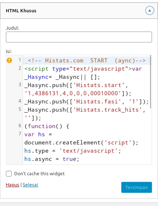 Kemudian kalian masuk ke menu widget dan pilih fitur html khusus dan pastekan code script yang diberikan oleh pihak Histats dan kemudian simpan.